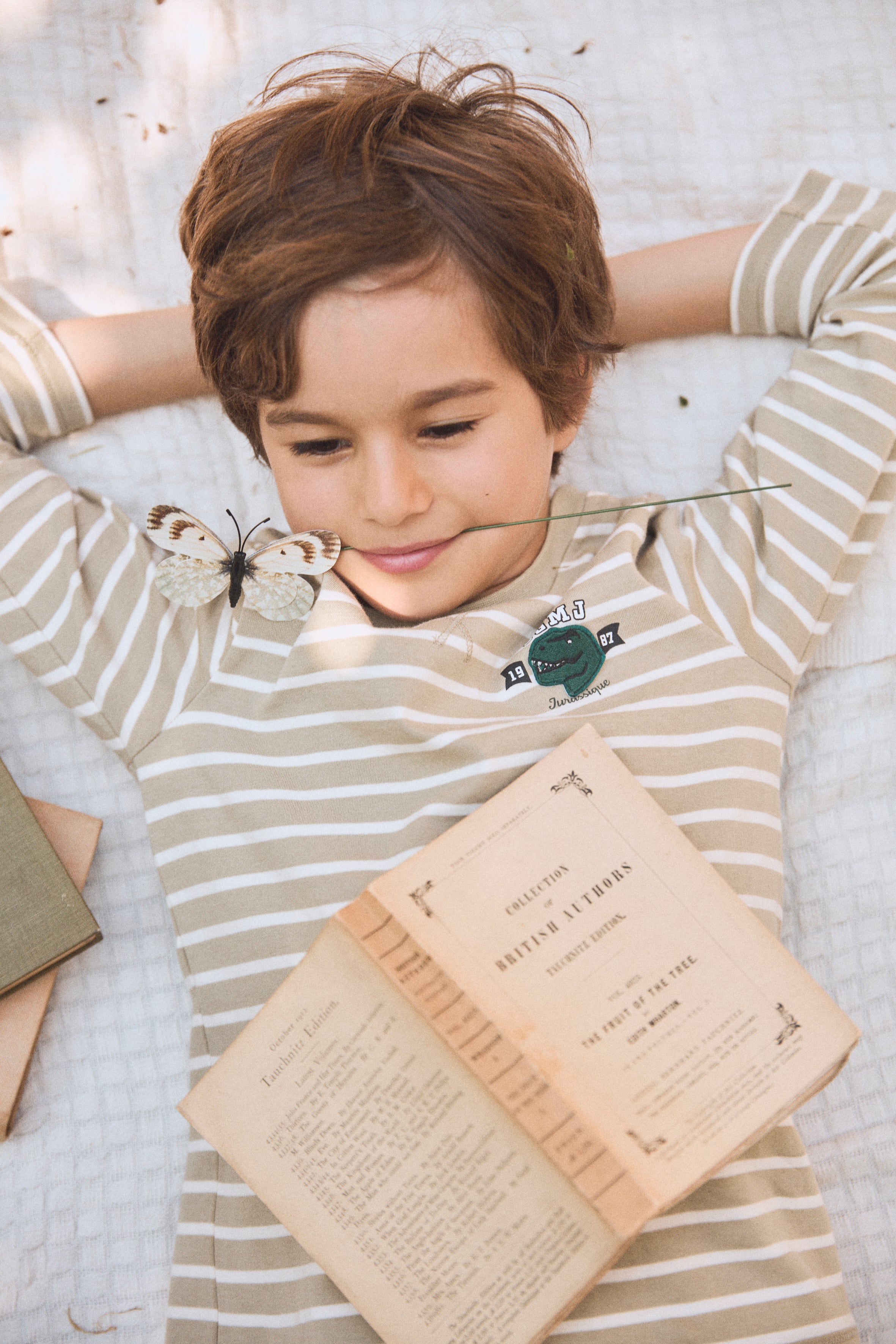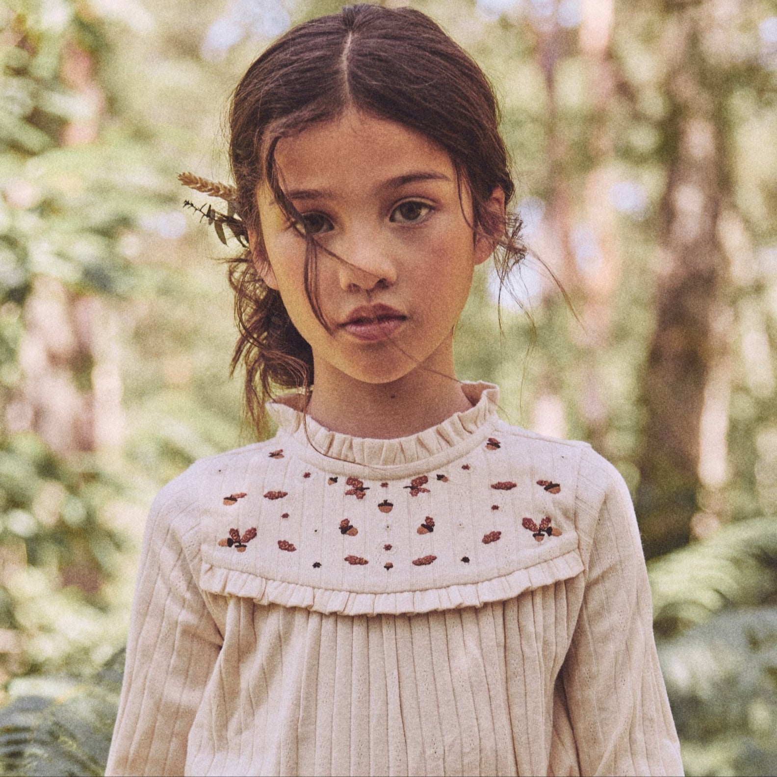 Entre feuillages dorés et parfums boisés, filles et garçons découvrent un univers tendre et magique, peuplé d’animaux, de champignons…et même d’un dinosaure campeur.