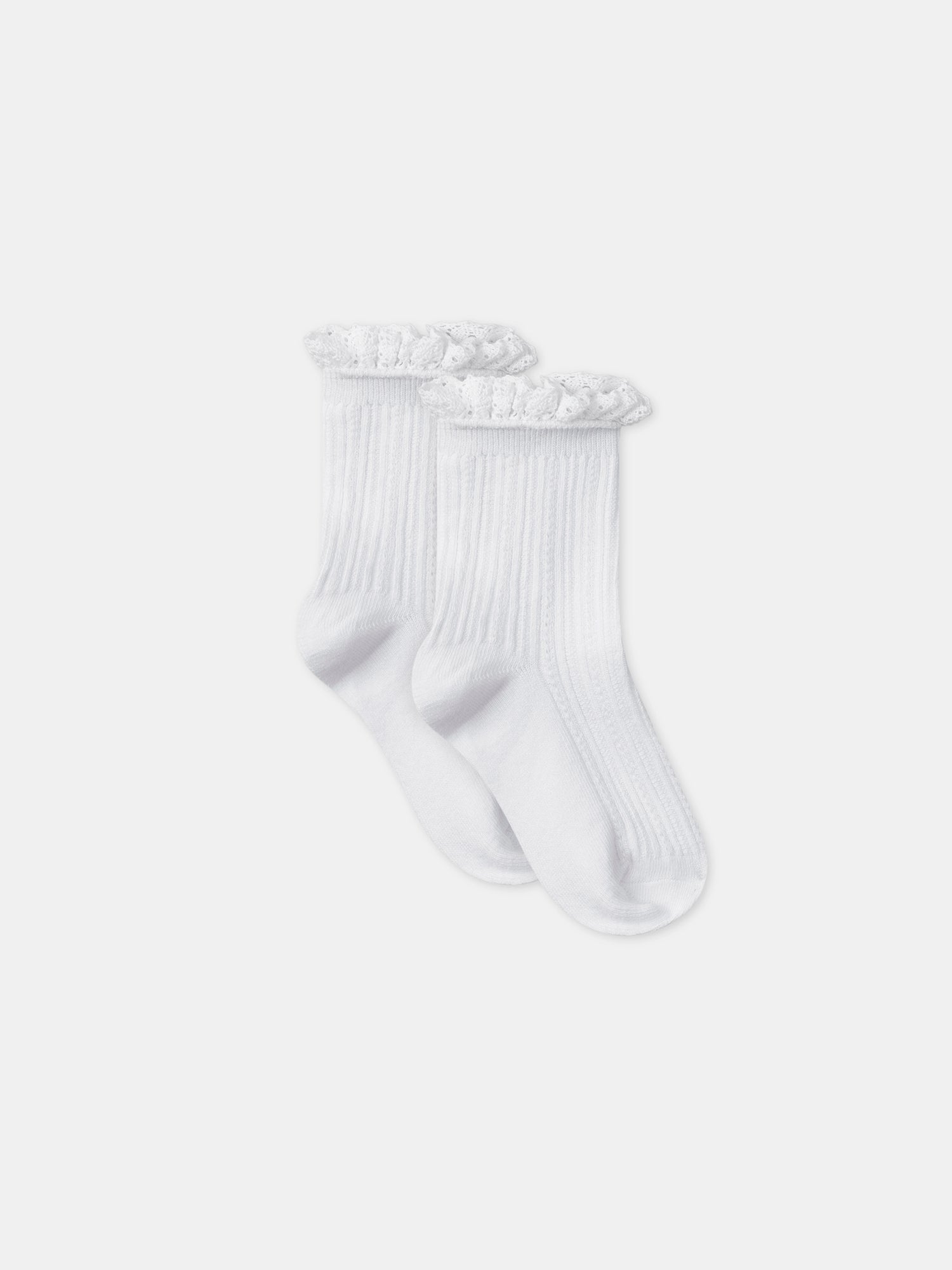 Les chaussettes écrues sont conçues avec un jacquard fantaisie ton sur ton, offrant un motif discret et élégant. Elles sont ornées de volants en dentelle sur le rib, ajoutant une touche délicate et raffinée à l'ensemble.