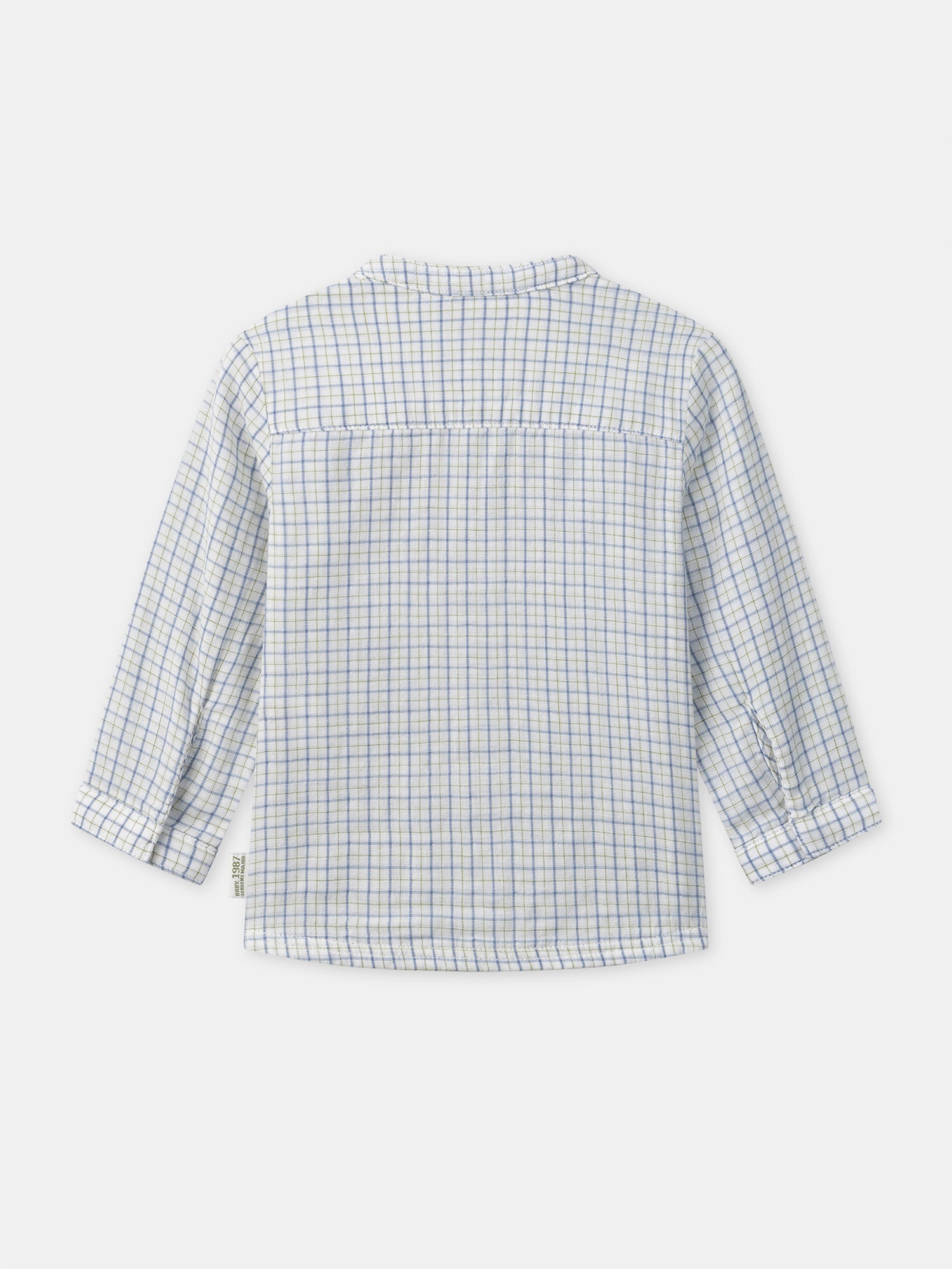 Pensée pour les petits explorateurs des saisons fraîches, cette chemise à carreaux allie style et confort. Elle présente un col Mao et une ouverture intégrale par boutons pour un habillage facile. L'imprimé carreaux bleu gris et kaki, la broderie oie sur le buste, ainsi que la vignette tissée « Baby 1987 Sergent Major » apportent une touche authentique et raffinée.