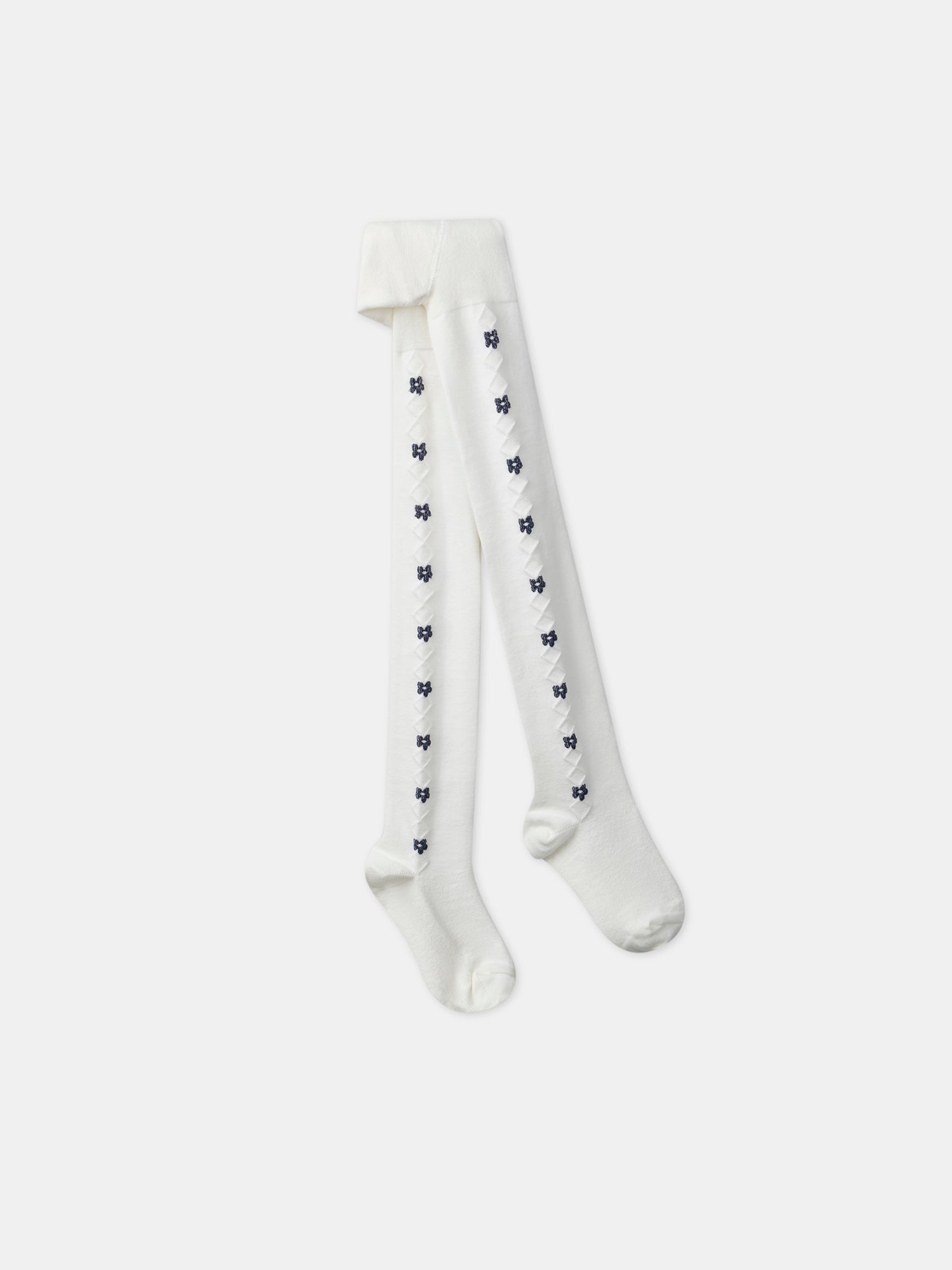 Le collant écru est décoré d'une tresse de fleurs marines, apportant une touche délicate et élégante à l'ensemble.