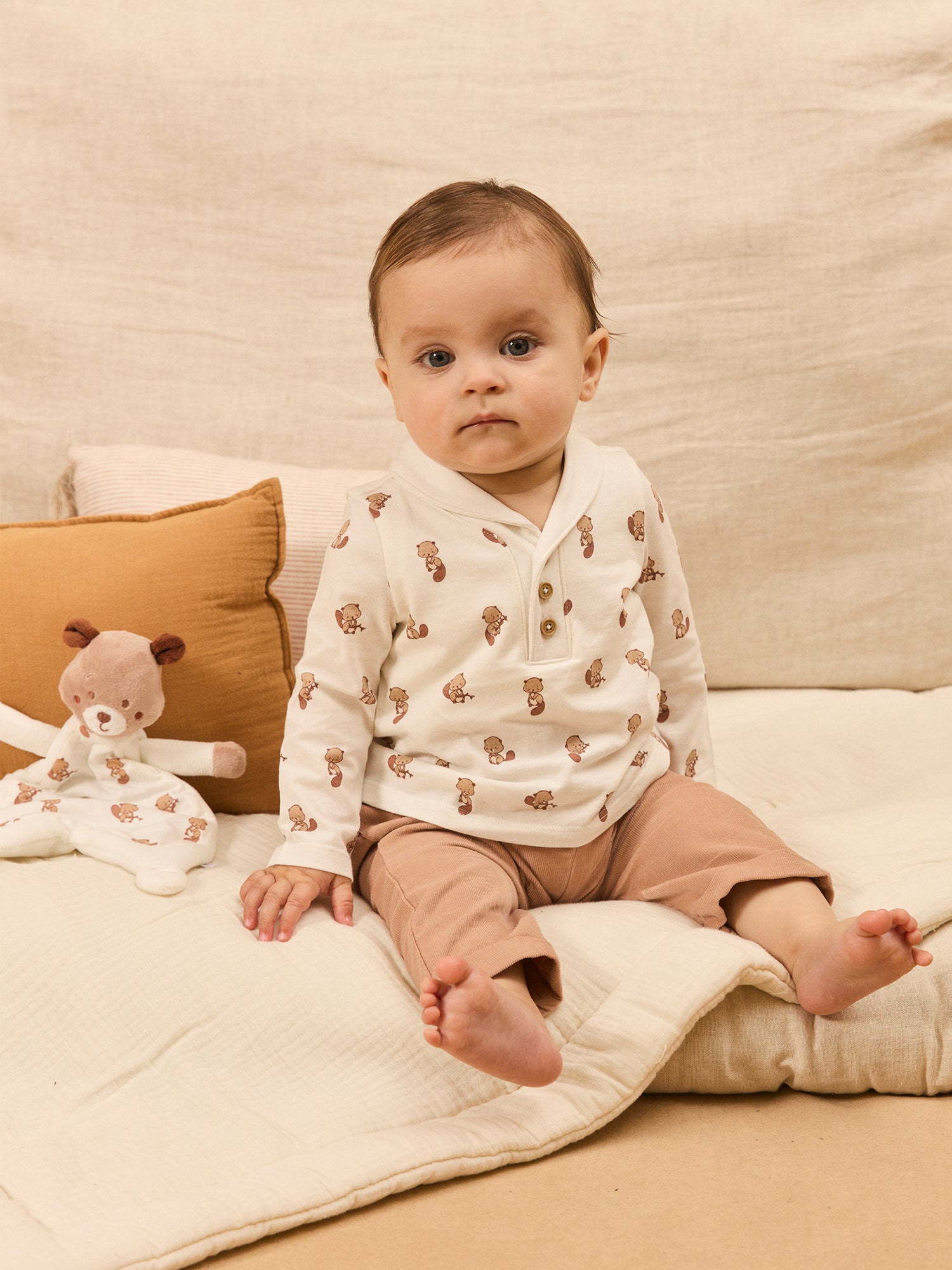 - Corps en velours milleraies écru et jersey imprimé castors dans les tons noisette et café au lait sur fond écru