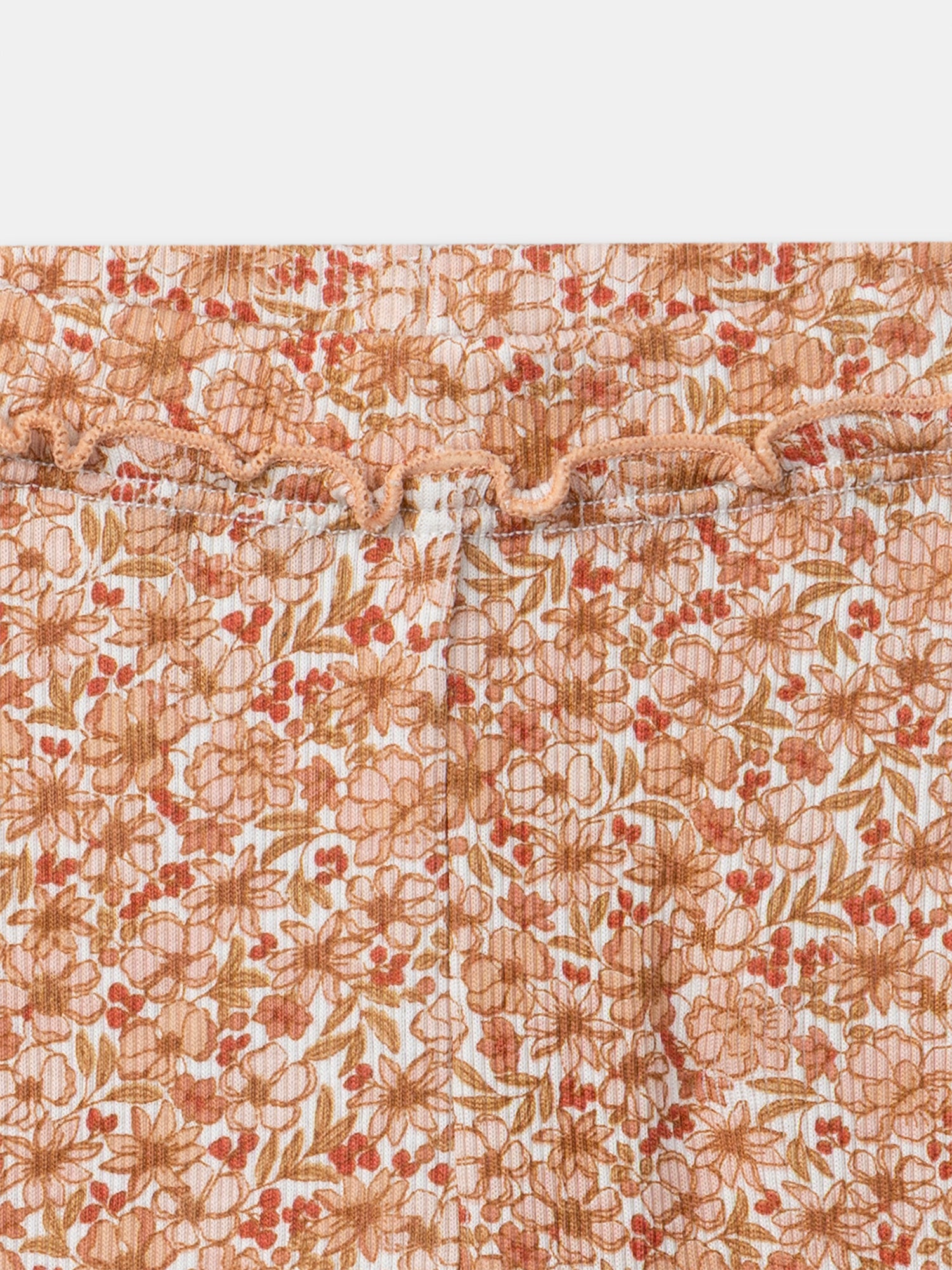 - Pantalon: Legging en côtes plates avec imprimé fleuri dans les tons rose poudré, orangé, groseille, corail et brun doux sur fond écru