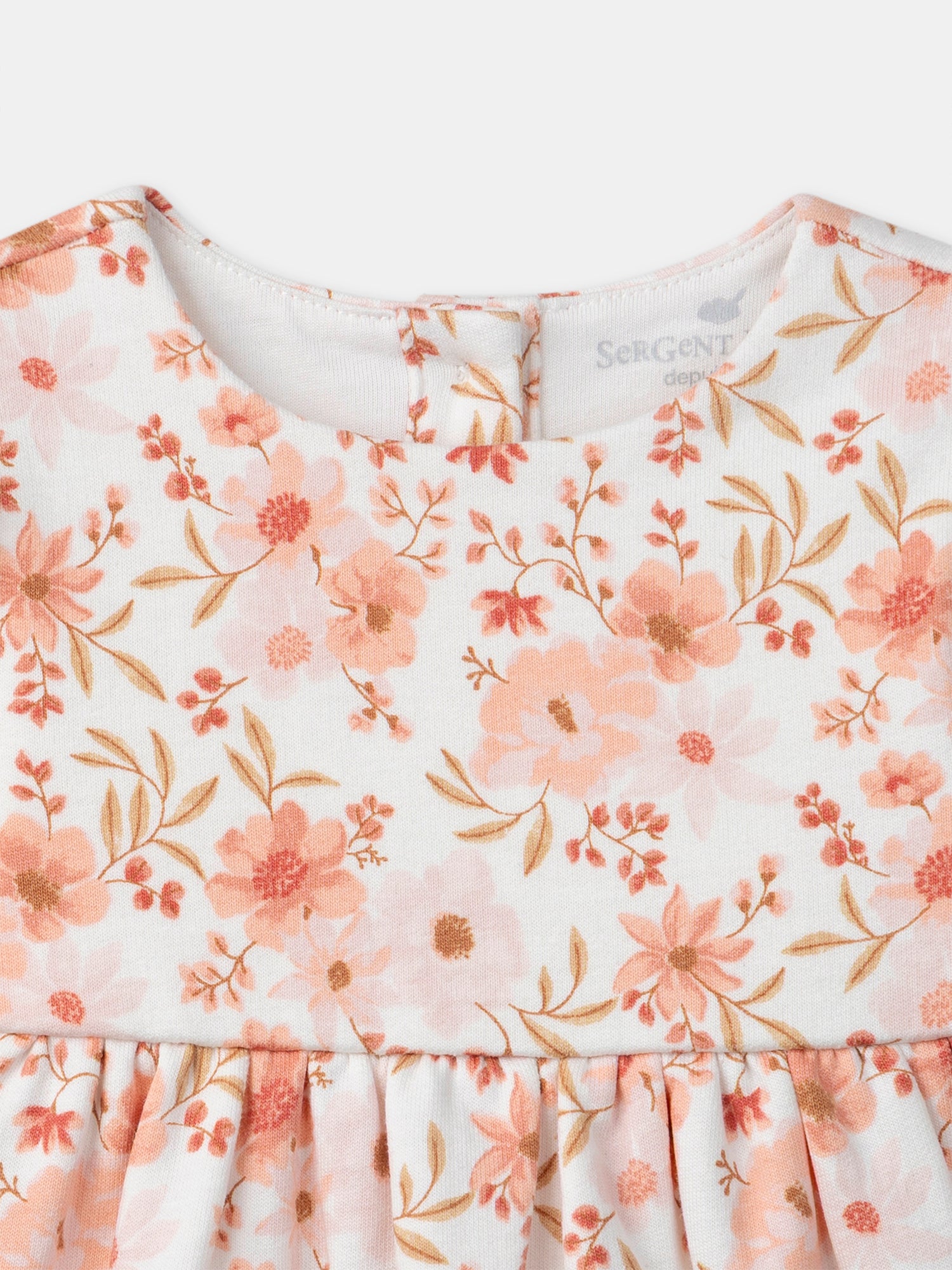 - Robe: robe milano avec imprimé fleuri dans les tons rose poudré, orangé, groseille, corail et brun doux sur fond écru
