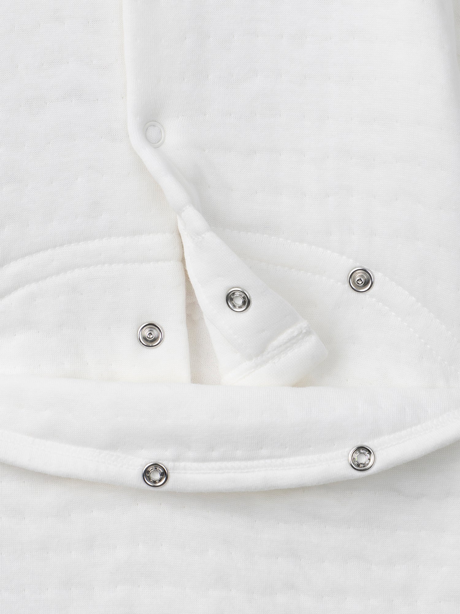 - Dessous des pieds et liseré en bas des manches en popeline avec imprimé fleuri dans les tons rose, jaune, vert tendre et fuchsia sur fond rose pêche