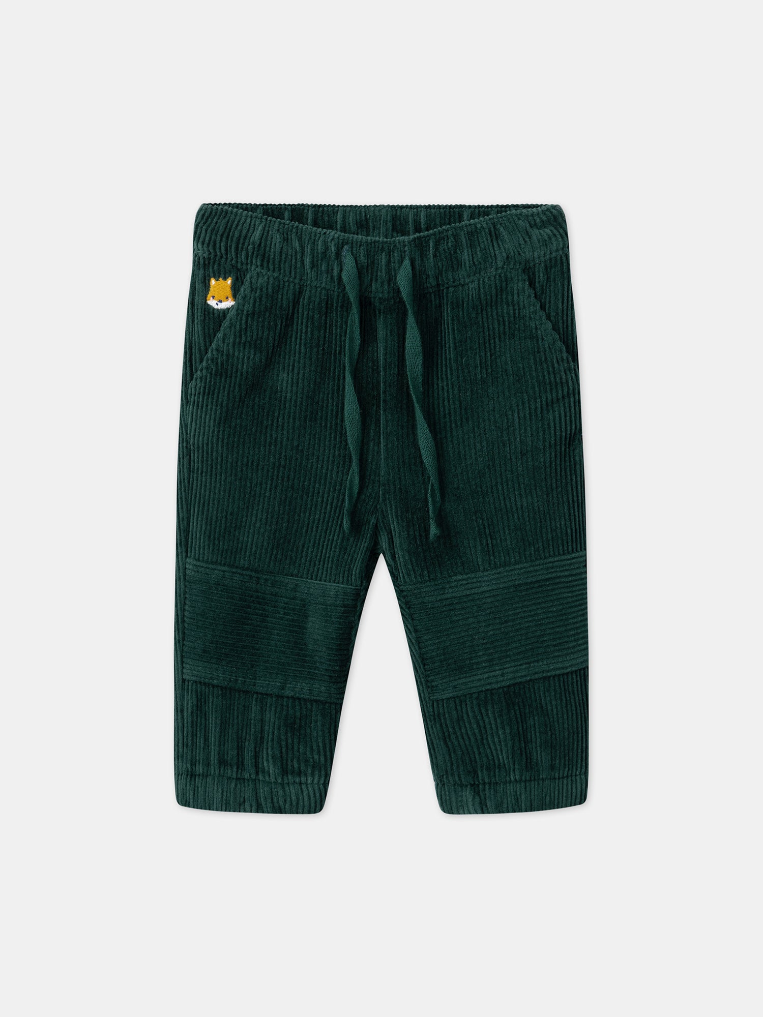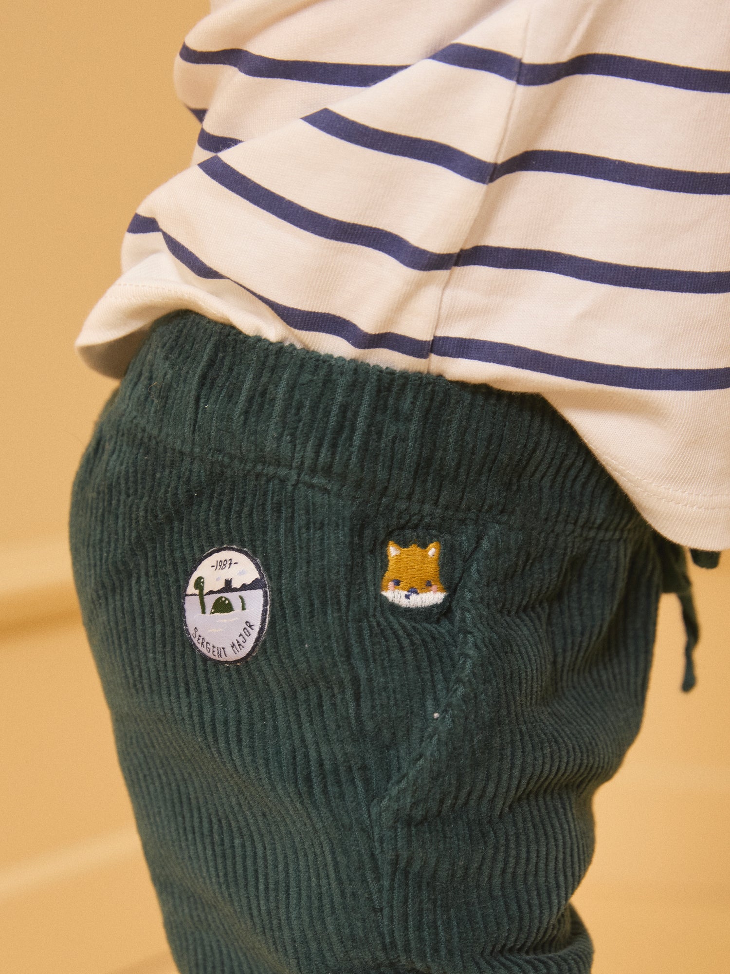 Pour les enfants qui aiment le confort et le style automnal, ce pantalon en velours côtelé est un choix idéal. Avec sa taille élastiquée et son cordon de resserrage, il assure un ajustement parfait tout au long de la journée. Les deux poches avant, le renard brodé sous la taille, et la vignette tissée fantaisie à l'arrière ajoutent des détails charmants et ludiques.