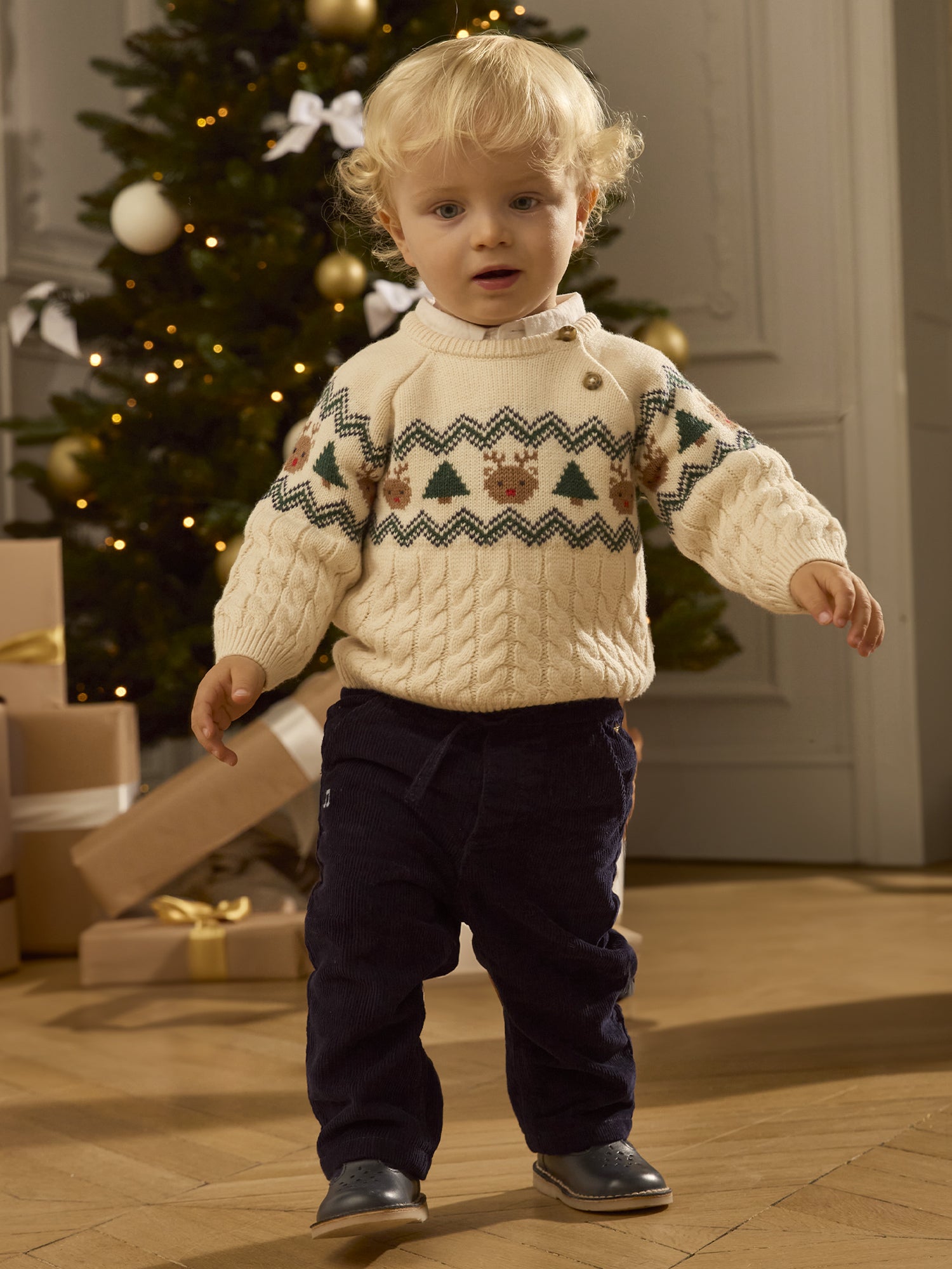 Ce pull torsadé et jacquard de Noël est parfait pour célébrer la saison avec style. Les visages de rennes et les sapins en vert sapin, bleu marine et beige ajoutent une touche festive et chaleureuse. Pratique, l'ouverture au col par boutons facilite l'enfilage.