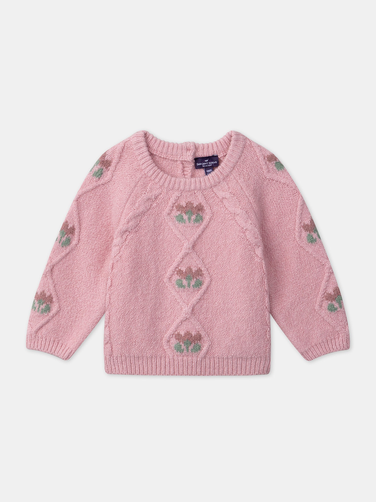 Ce pull torsadé rose pâle apporte une touche de douceur à la garde-robe de votre petite fille. Avec ses motifs floraux délicats sur les manches et à l'avant, il évoque un style printanier et joyeux. L'ouverture au dos, agrémentée de boutons fantaisie, ajoute une note ludique tout en facilitant l'enfilage. Un choix parfait pour allier confort et élégance !
