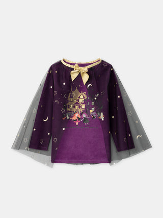 Parfait pour les enfants qui aiment se déguiser et rêver, ce pyjama accompagne les soirées fraîches d’automne. Conçu en velours doux, il se porte confortablement et s’accompagne d’une cape légère en tulle. Ses motifs phosphorescents de petites sorcières et sa cape étoilée transportent l’enfant dans l’univers magique d’Halloween.