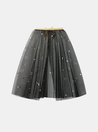 - Cape en tulle noire, imprimés étoiles et lunes dorées