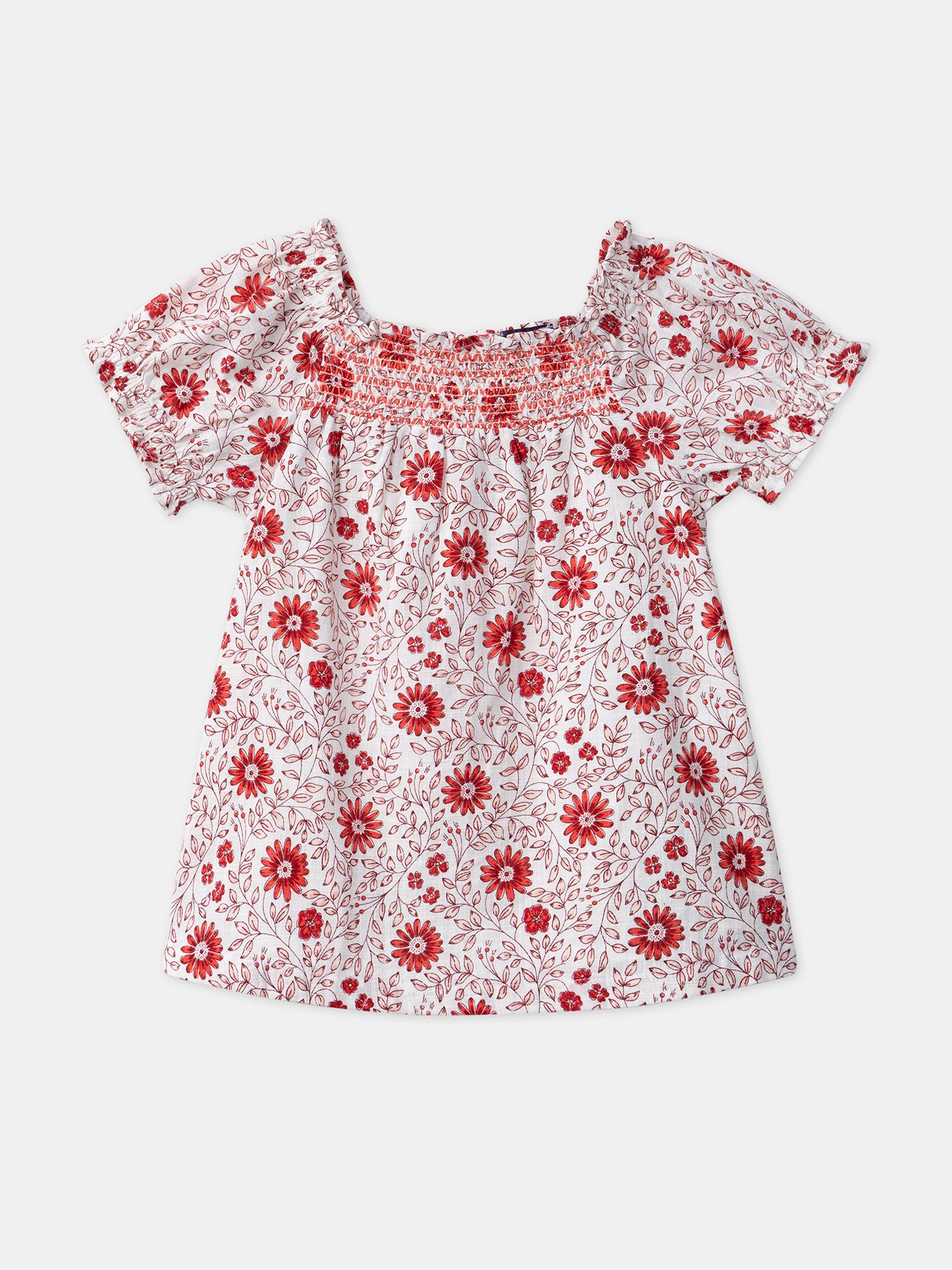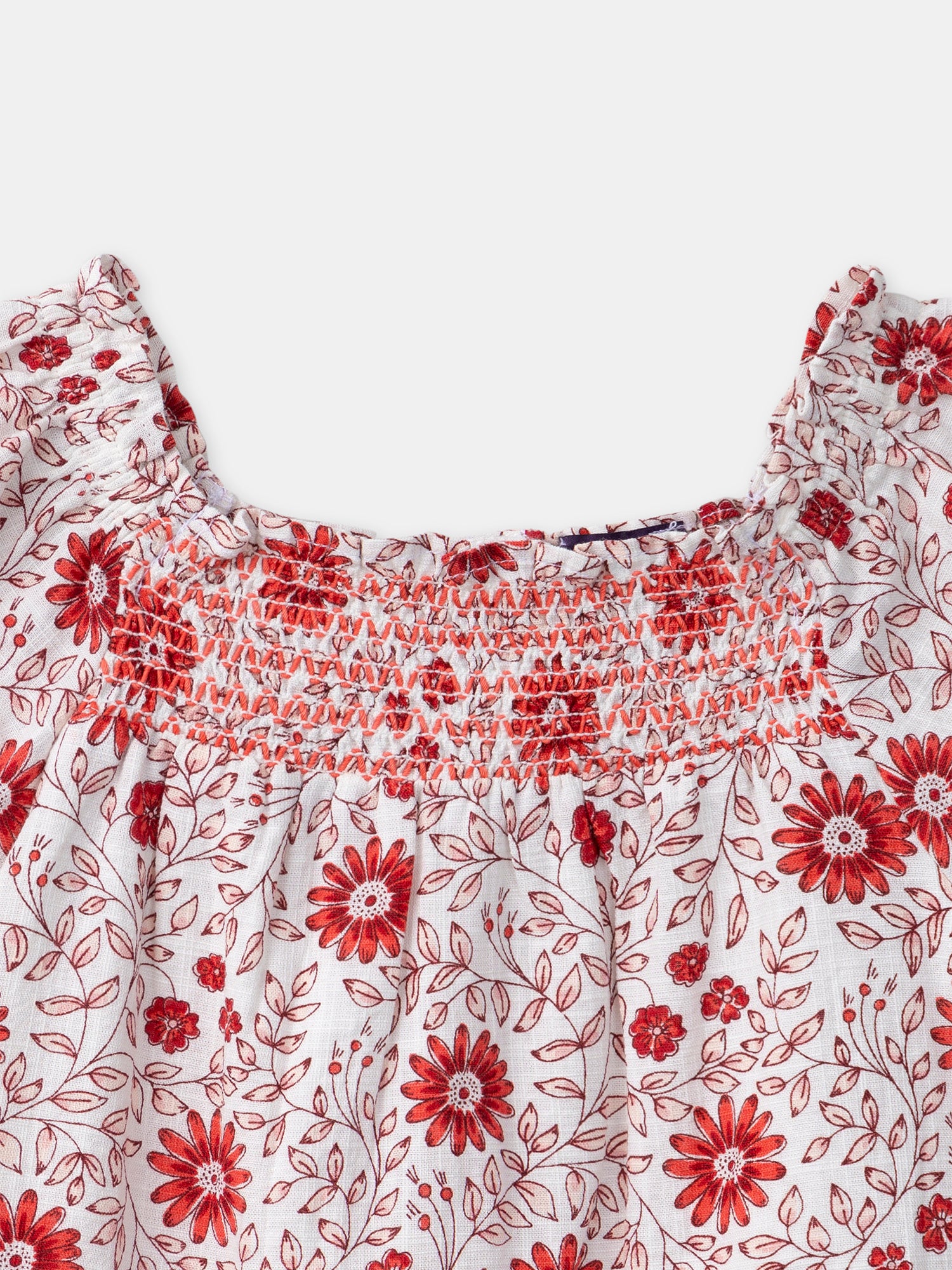Cette robe fleurie est parfaite pour les journées ensoleillées, avec son imprimé de fleurs roses claires et rouges sur fond écru. Les manches courtes ballon et les smocks sur le buste offrent une coupe confortable et élégante, tandis que l'encolure élastiquée et la doublure intégrée assurent un confort optimal. L'ouverture dos intégrale par boutons imprimés et son bloomer assorti ajoutent une touche pratique et charmante à cette tenue délicate.
