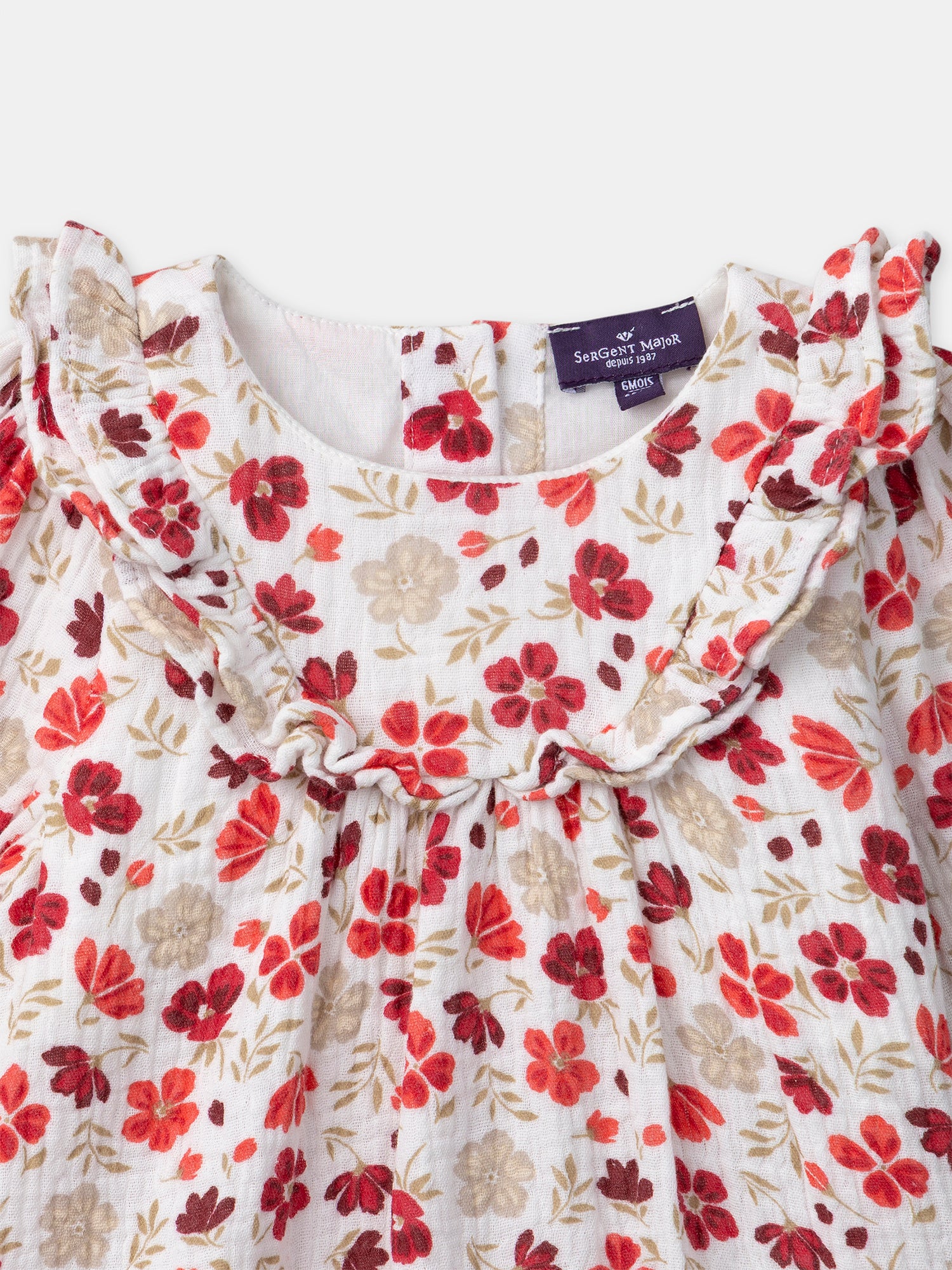 Pour les petites rêveuses qui aiment la légèreté au printemps, cette robe imprimée est un choix tout en douceur. Sa coupe fluide, avec volants sur le buste et ouverture intégrale au dos par boutons, garantit confort et aisance. L'imprimé floral bordeaux, corail et beige sur fond écru crée un univers délicat et naturel, parfait pour les journées ensoleillées.