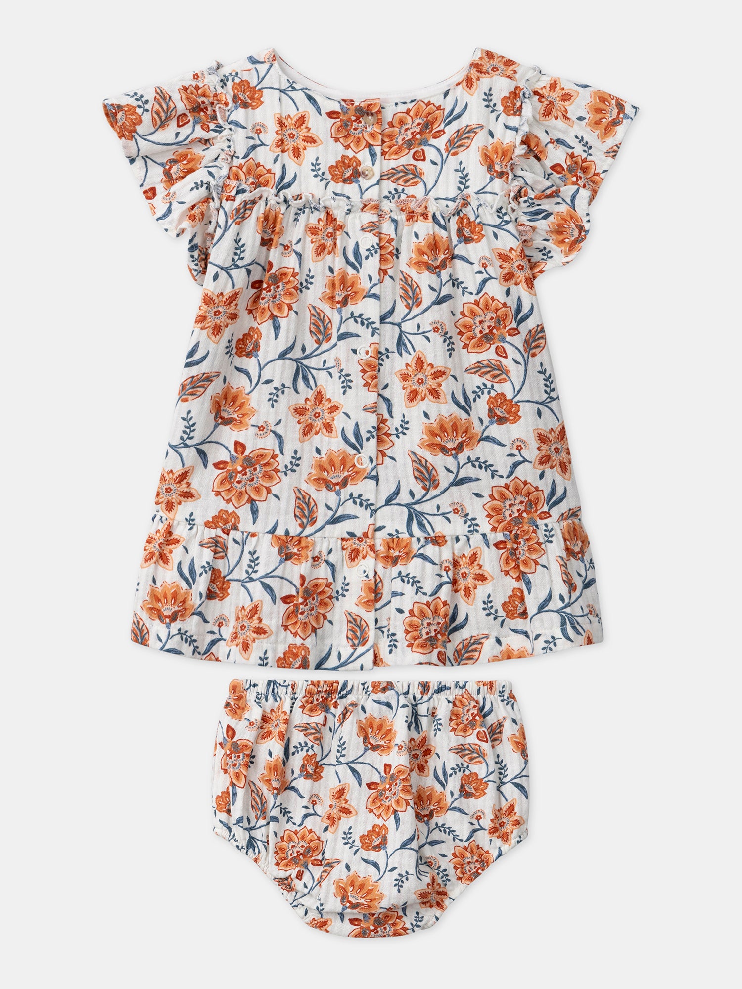 La robe imprimée fleuri présente un motif floral dans les tons orange, bleu foncé et marron sur fond rose pâle. Son buste est orné de volants, apportant une touche délicate et aérienne. Elle est accompagnée de son bloomer assorti pour un look harmonieux. Pratique, son ouverture au dos est intégrale par boutons fantaisies.