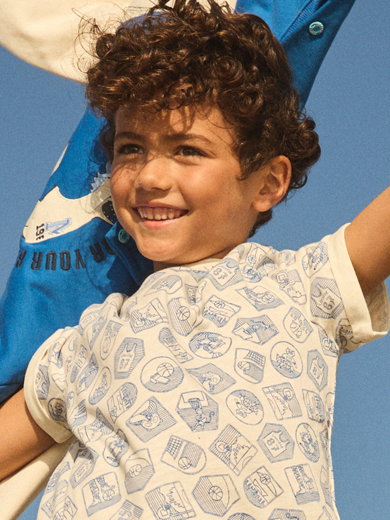 Ce t-shirt Basketball est parfait pour les enfants dynamiques, idéal pour les journées actives. Son motif alliant basketball et animaux apporte un côté fun et original, tandis que les revers aux manches ajoutent une touche stylée. Le bord-côte au col assure confort et maintien tout au long de la journée.